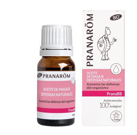 El aceite de masaje“Defensas naturales“es un aceite con certificación ecológico**, a base de aceites esenciales de palmarosa, abeto negro, katrafay, mejorana y romero qt verbenona. Esta sinergia aromática es una excelente aliada de las mamás que quieren ofrecer la máxima protección a su bebé. Es muy fácil de utilizar en bebés de más de 3 meses : solo hay que aplicar 3 gotas de este aceite en las plantas de los pies del bebé y masajear. El masaje debe realizarse preferentemente por la mañana y por la noche.