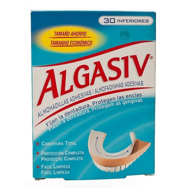 Algasiv almohadillas adhesivas para la dentadura inferior. Sujeción garantizada todo el día sin molestias ni irritaciones. Acomodan perfectamente la dentadura a las encías. No tiene olor ni sabor, no desprende sustancias y se limpia facilmente.