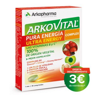 Arkovital® Pura Energía Ultra Energyaporta vitaminas B2, B6 y C, que ayudan a disminuir el cansancio y la fatiga. Su fórmula enriquecida en cafeína 100% vegetal, ayuda a mejorar la concentración.