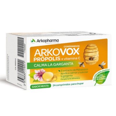 Arkovox® Comprimidos Própolis y Vitamina C es un complemento alimenticio a base de extracto de Malvavisco, Papaína, extracto de Própolis y Vitamina C.