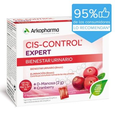 Cis-Control® Expert en sobres aporta en 2 tomas 36 mg de proantocianidinas (PAC) de arándano rojo, 2000 mg de D-Manosa y 250 mg de extracto de Brezo.
