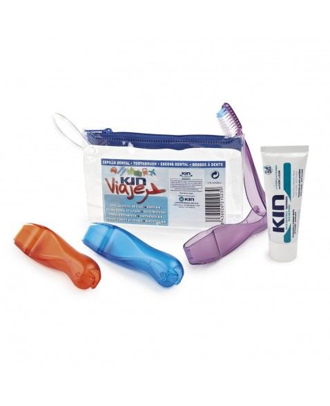 Cepillo dental diseñado con un mango anatómico antideslizante plegable para poder llevarlo siempre encima. Incorpora dentro de un práctico neceser un tubo de dentífrico Kin de 25 ml.