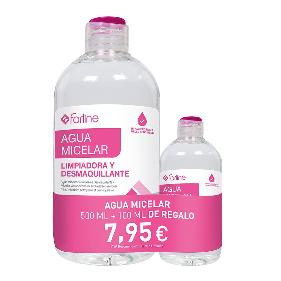Pack Promocional de Agua Micelar 500 ml + envase de 100 ml, ideal para llevar de viaje. El Agua micelar limpia y desmaquilla ojos y rostro en un solo gesto. No contiene perfume ni alcohol y resulta ideal para el cuidado de pieles sensibles. Hipoalergénica.