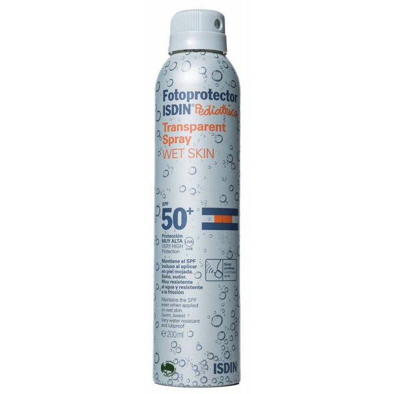 Ofrecen unamuy alta protección UVB UVA SPF50 HE-VL y IR-A.Transparent Spray Wet Skin permite que el producto se adapte totalmente a tu piel aportándole una protección flexible y ligera derápida absorción. Siente tu piel sin brillos y con un tacto final ultraseco y sedoso que evitará que la arena se pegue a la piel. Además gracias a latecnología Wetflex de ISDIN, podrás aplicarte el fotoprotector incluso sobre piel mojada manteniendo el factor de protección y la eficacia protectora del producto sin dejar residuo blanco