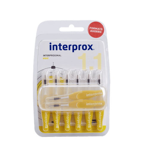 Interprox® mini ha sido diseñado para eliminar el biofilm bucal (placa bacteriana) acumulado en los espacios interproximales de 1.1 mm* y es especialmente recomendable para los dientes anteriores.