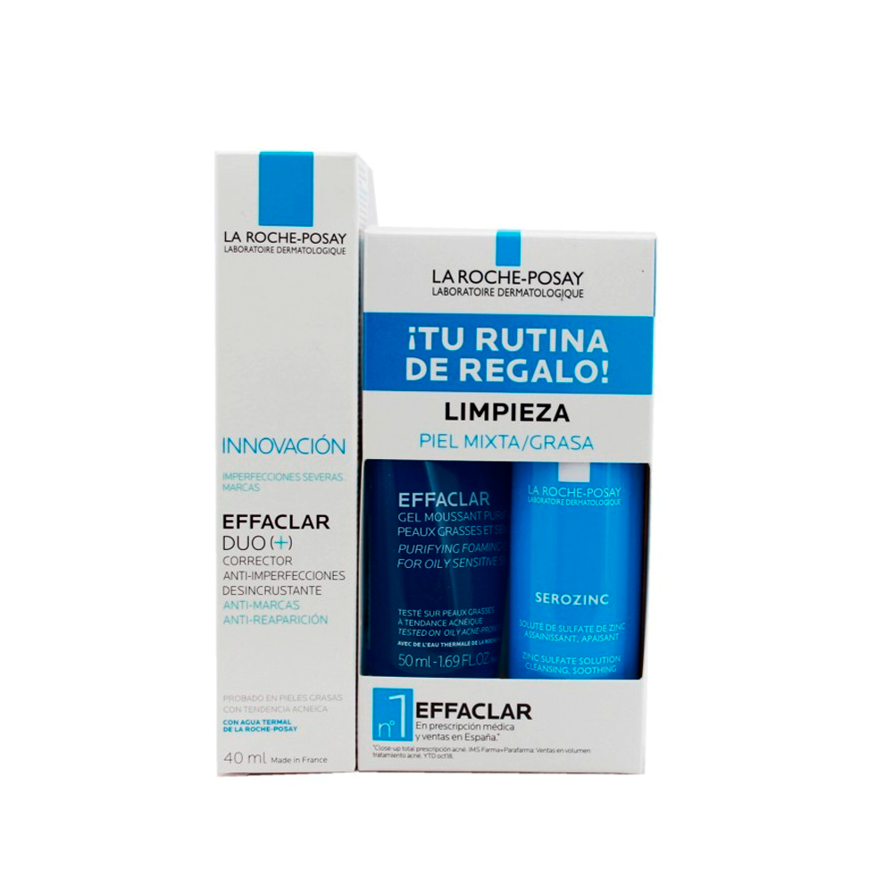 La Roche Posay Effaclar Duo+ Anti-Imperfecciones 40ml + Regalo Rutina de Limpiezaelimina las imperfecciones severas de la piel. Effaclar Duo+ Anti-Imperfecciones es un tratamiento completo con una eficacia anti-imperfeciones reforzada con Procerad, activo anti-marcas, cerámica, activo anti-irritaciones, que ayuda a prevenir que las imperfecciones dejen marcas rojas u oscuras. De regalo contiene una rutina de limpieza compuesta por un gel limpiador y serozinc. El gel purifica la piel con suavidad gracias a agentes limpiadores seleccionados para respetar las pieles sensibles. Serozinc es una solución de sulfato de zinc que purifica y calma las pieles irritadas en su superficie.