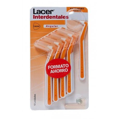 Lacer Cepillo Interdental Angular ExtraFino Suave (0,5 mm) 10 u. Indicado para eliminar la placa bacteriana en losespacios interdentales estrechos. Apto para la sensibilidad gingival, encías con tendencia al sangrado, zonas intervenidas quirúrgicamente, zonas furcales, implantes recientes, etc. Es ideal paraespacios interdentales estrechos y muy sensible (0,5 mm).