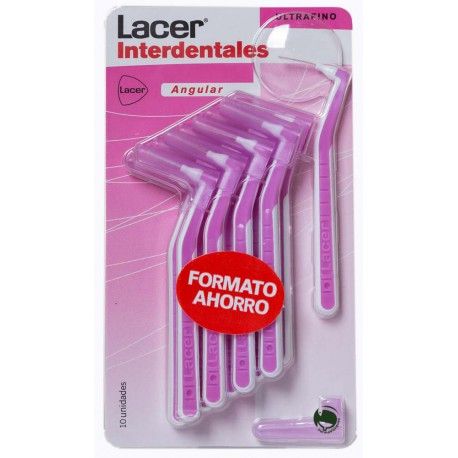 Lacer Cepillo Interdental Angular Ultrafino (0,45mm) 10 u.Indicado para eliminar la placa bacteriana en losespacios interdentales estrechos. Idóneo para prótesis fijas, implantes y portadores de aparatos de ortodoncia. Es ideal paraespacios interdentales extremadamente estrechos (0,45 mm).