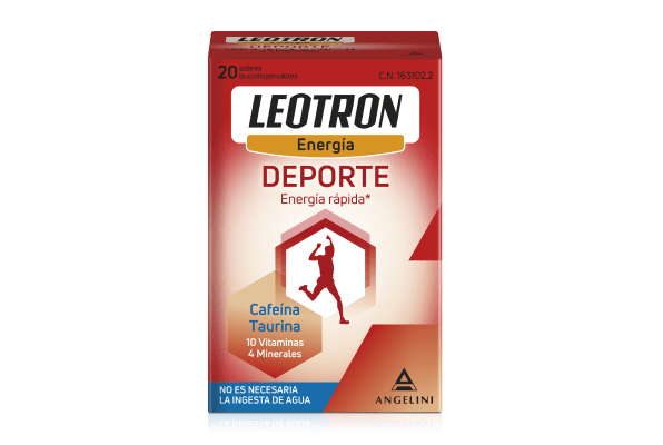 Leotron Deporte es un complemento alimenticio con Cafeína, Taurina, Fosfoserina, 10 Vitaminas y 4 Minerales, con azúcares y edulcorantes.