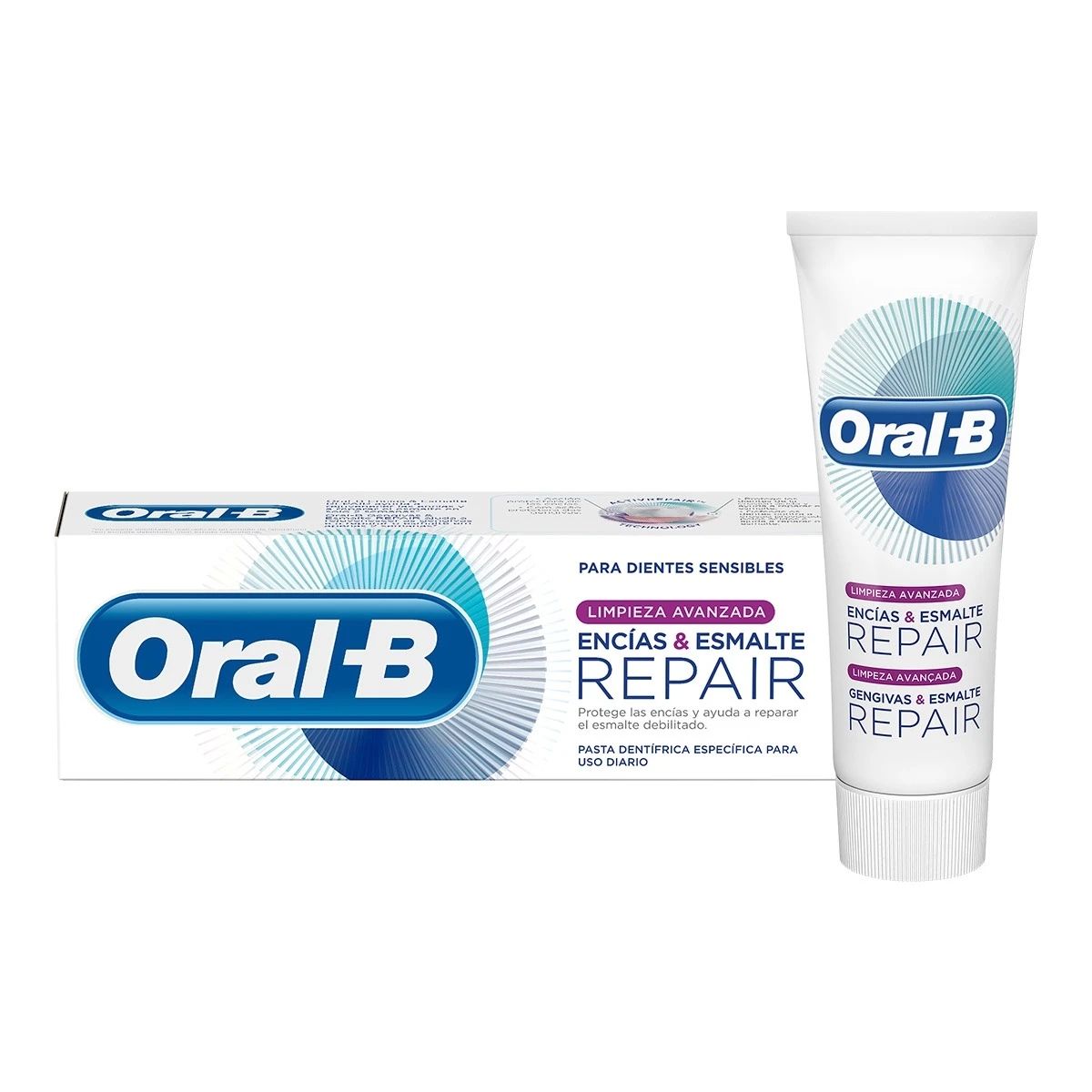 La pasta dentífrica Oral-B Encías & Esmalte Repair Limpieza Avanzada para dientes sensibles ayuda a rejuvenecer tus encías y a reparar el esmalte en solo 2 semanas. Su tecnología única ActivRepair ayuda a rejuvenecer las encías al tiempo que las protege. Ayuda a reparar el esmalte y protege los dientes frente a la erosión ácida.