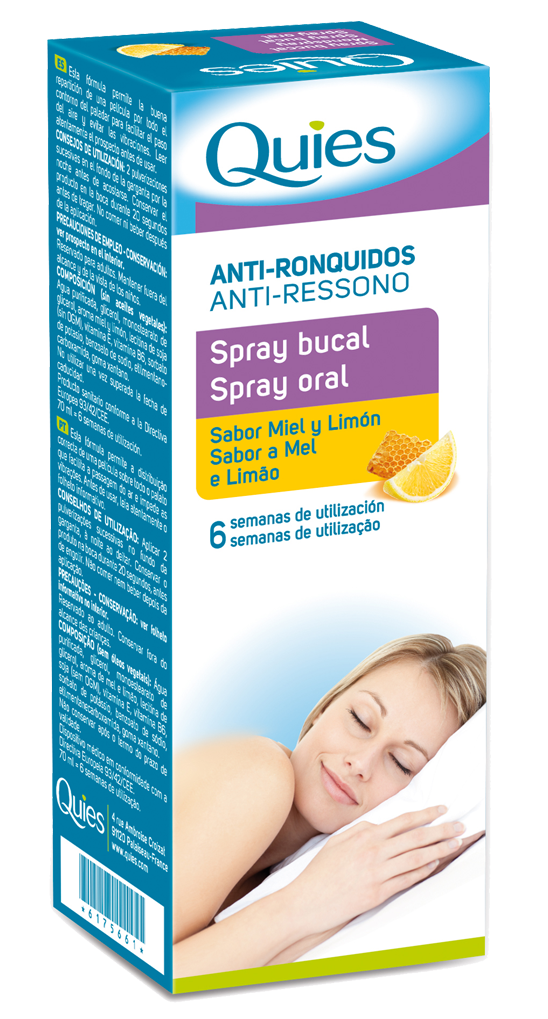 El spray antirronquido Quies actúa directamente sobre las causas del ronquido: gracias a la goma xantana, lubrica el velo del paladar, evitando así las vibraciones en el momento de la respiración. Formulados sin aceites vegetales, sus activos mantienen un buen grado de humedad en el fondo de la garganta durante toda la noche.