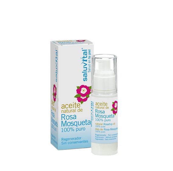 El Aceite Puro de Rosa Mosqueta Saluvital, obtenido por primera presión en frío, presenta un elevado contenido en ácidos grasos esenciales, aproximadamente un 80 % de su composición, que le confieren excelentes propiedades regeneradoras. Tambien contiene carotina, flavonoides, y vitamina C; así como tretinoina natural, un derivado del retinol (vitamina A), que estimula la regeneración del tejido epidérmico. Atenúa cicatrices, estrías y arrugas, previene el envejecimiento prematuro de la piel y difumina las manchas de la misma.