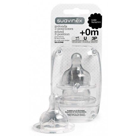 EstaTetina Redonda 3 Posiciones Suavinexes para niños desde el primer día de vida. Se puede adaptar con un pequeño movimiento a la succión del pequeño de la casa. Contiene dos unidades. Su diseño consigue evitar las molestias como el hipo o los cólicos gaseosos que se pueden producir por la ingesta de aire. Este producto deSuavinex está avalado por la Sociedad Española de Ortopediatría