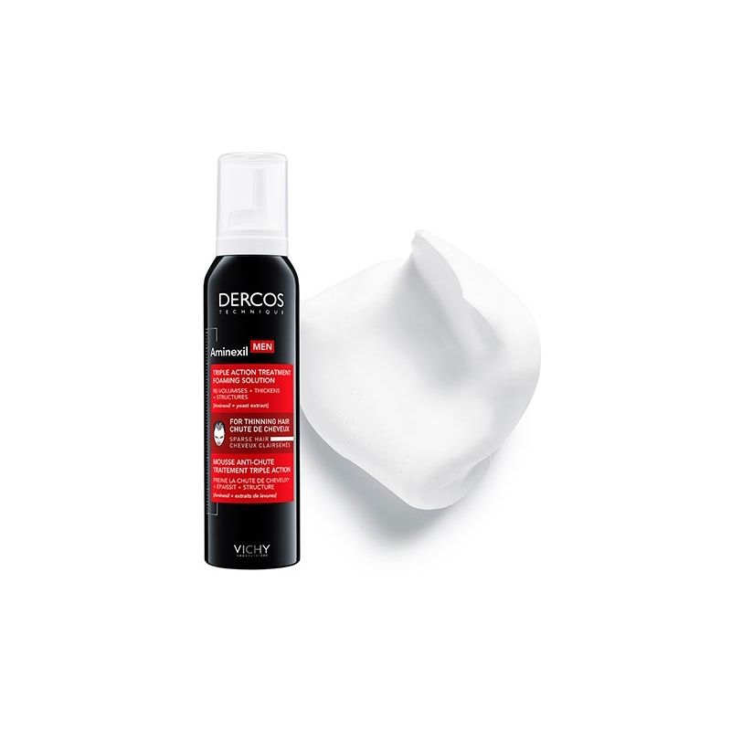 Vichy Dercos Men Tratamiento Triple Acción Espuma 150 ml. Se recomienda agitar antes de abrir. 2 Tapones equivalen a una dosis. Aplicar la espuma sobre el cuero cabelludo y masajear. No aclarar.