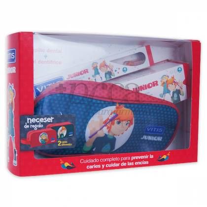 La promoción incluye Vitis junior cepillo dental 6A+ (1 unidad) + Vitis junior gel dentífrico 6A+ (75ml) + Estuche de regalo.